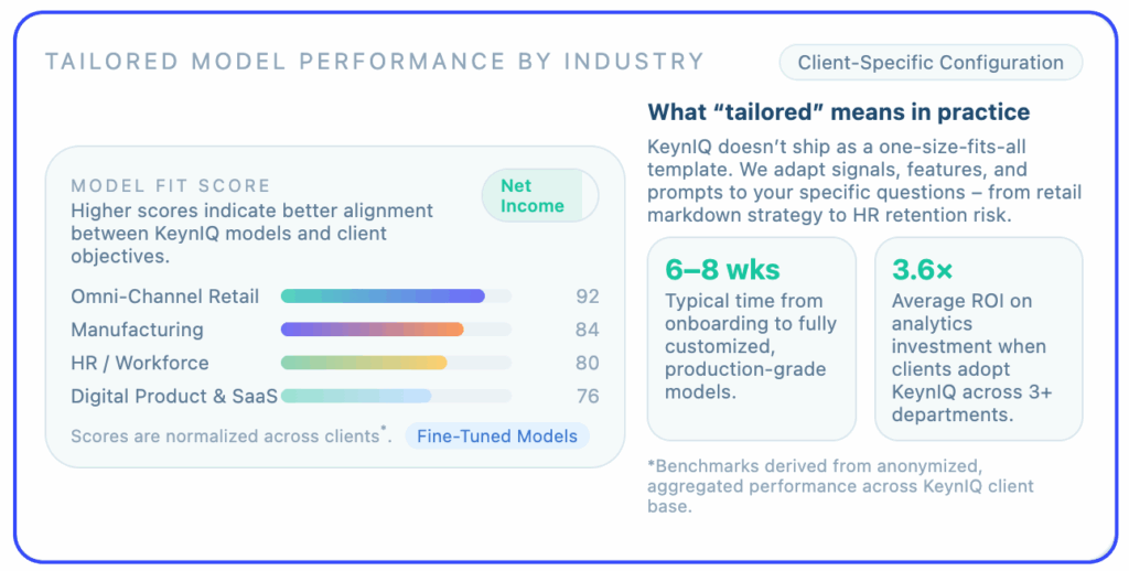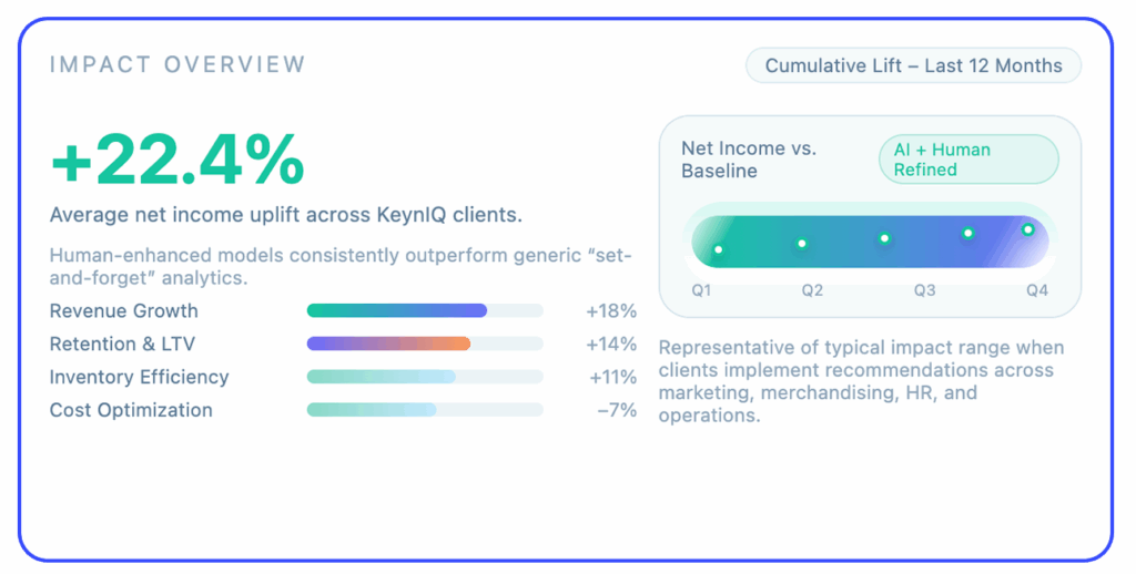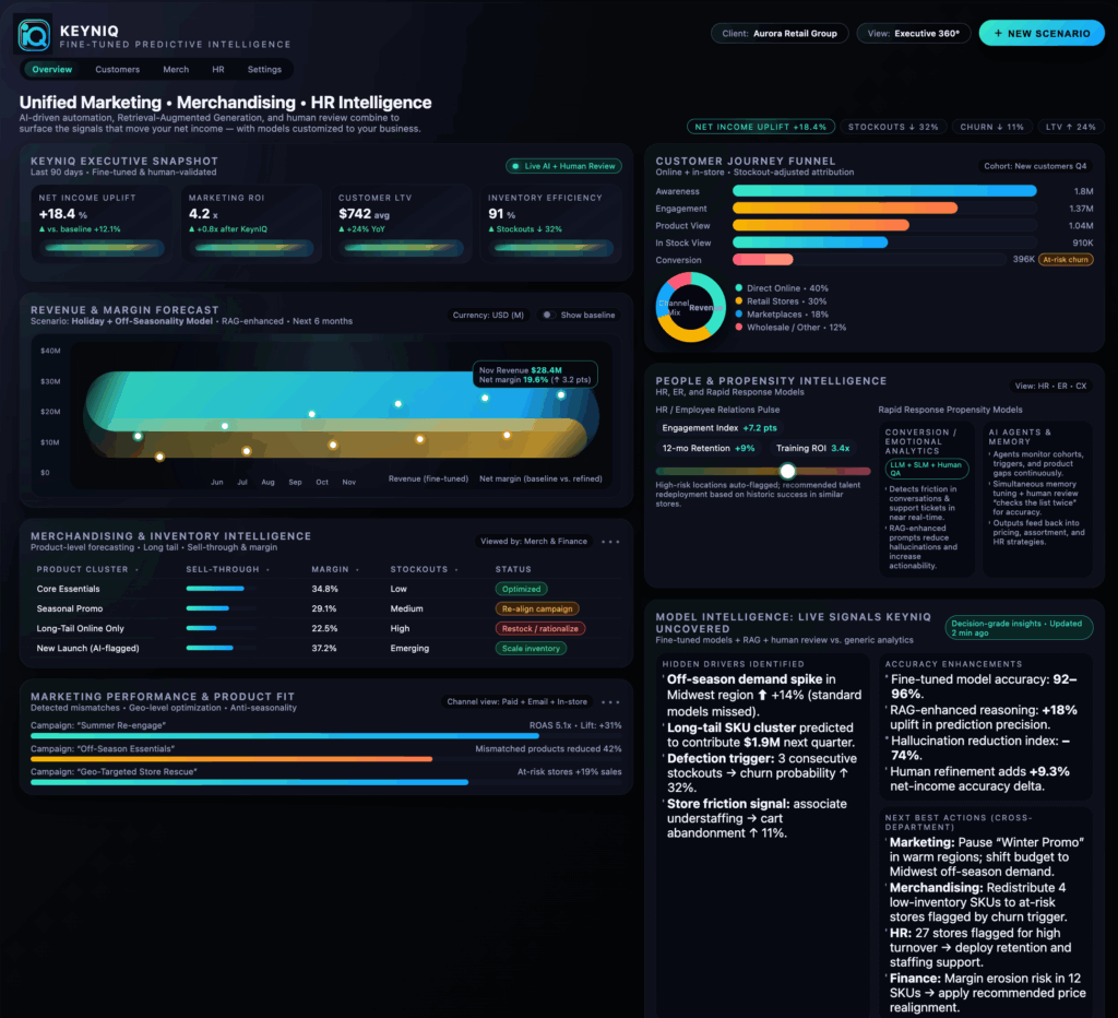 Revolutionizing Data-Driven Decisions “Keyn Insights technology is unlike anything we’ve used before. Their holistic approach to the customer journey, combined with cutting-edge AI and machine learning, has revolutionized how we approach product forecasting and customer engagement. The customizable reports and rapid response models have made our teams more agile, allowing us to adapt quickly to market changes. We’ve seen a marked increase in both revenue and customer satisfaction.”
